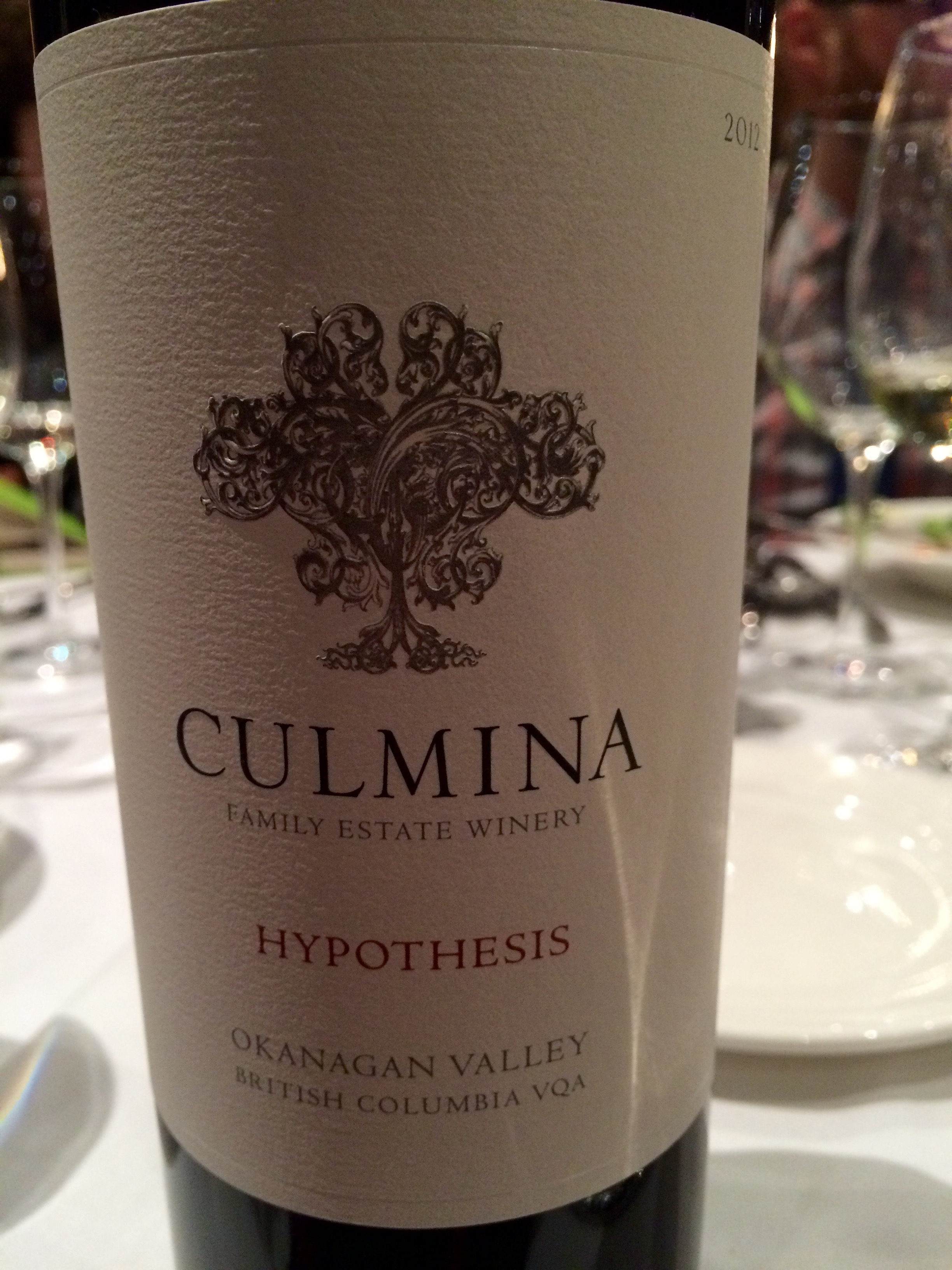 Hypothesis is Culmina’s top wine, and the one it’s hoping will be its icon. The blend shifts every year (2011 was mostly Cab Franc), but the 2012 is 57& Merlot, 24% Cabernet Sauvignon and 21% Cabernet Franc. Each varietal was harvested separately — the Cab Sauv two weeks later than the rest, on November 10th! — and the resulting wine was aged in 70% new French oak for 16 months before bottling. Hypothesis is meant to be an aging wine, one to open in 5+ years as opposed to right now.
