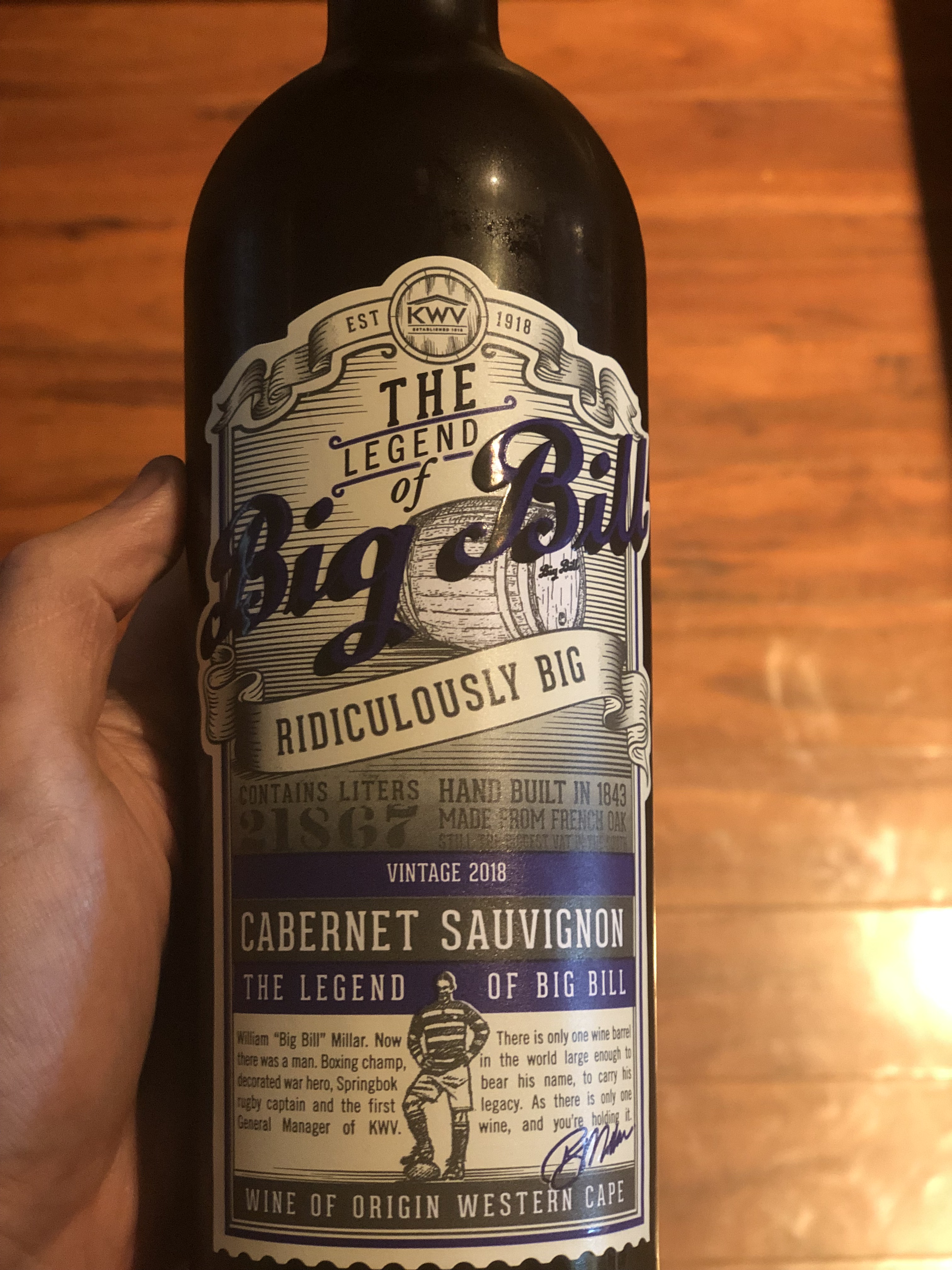2018 KWV Big Bill Cabernet Sauvignon (~$14): Now this is a fun label. Depicted here is KWB’s first general manager, William “Big Bill” Millar: decorated war veteran, boxing champion, and rugby captain. If Bill asks you if this wine is good, you should probably just say yes. This Cab is named in honour of the man as well as a gigantic 22,000-litre oak vat (named after Bill himself) that still resides on KWB property. No, this wine was not made in said vat, but allegedly the two Bills did provide some inspiration. Although the visual resolution is not high, the depiction on the label does conjure up some unfortunate associations with the guy an ex-girlfriend downgraded to when she left. Shudder. Shaking this off, I pour a “ridiculously big” glass of dark ruby wine, noting a few blue-purple highlights, and take a sniff. The nose provides a pleasant sweet impression, albeit not cloying, with pungent cassis, blackberry, blueberry, and liquorice strands of both colours (red and black) playing off of a few savoury elements that recall weakly-steeped black tea and grilled sirloin tips. The jammy fruits combine with the initially rather stark, dry oak aromas to yield maraschino cherries, and as the wine gets some air one can discern toffee, almonds (again, chocolate-covered), and wintergreen, with this latter note rather aggressively reminding me that yes, this is indeed a Cape wine and not entry-level Napa Valley. There’s more tannin than expected perhaps, fine round beads that become scratchy as they accumulate on the gums. This begins in delicious form, but as such wines are wont to do, it becomes cloying once you’ve parsed a few layers and are done being wowed by the “ridiculously big” slab of berry Pop tart. The average Wagnerian might approve of the price point but balk at the notion that this is truly easy to drink. No need to linger on it too long, although it is much better than a poorly made cocktail. 87- points