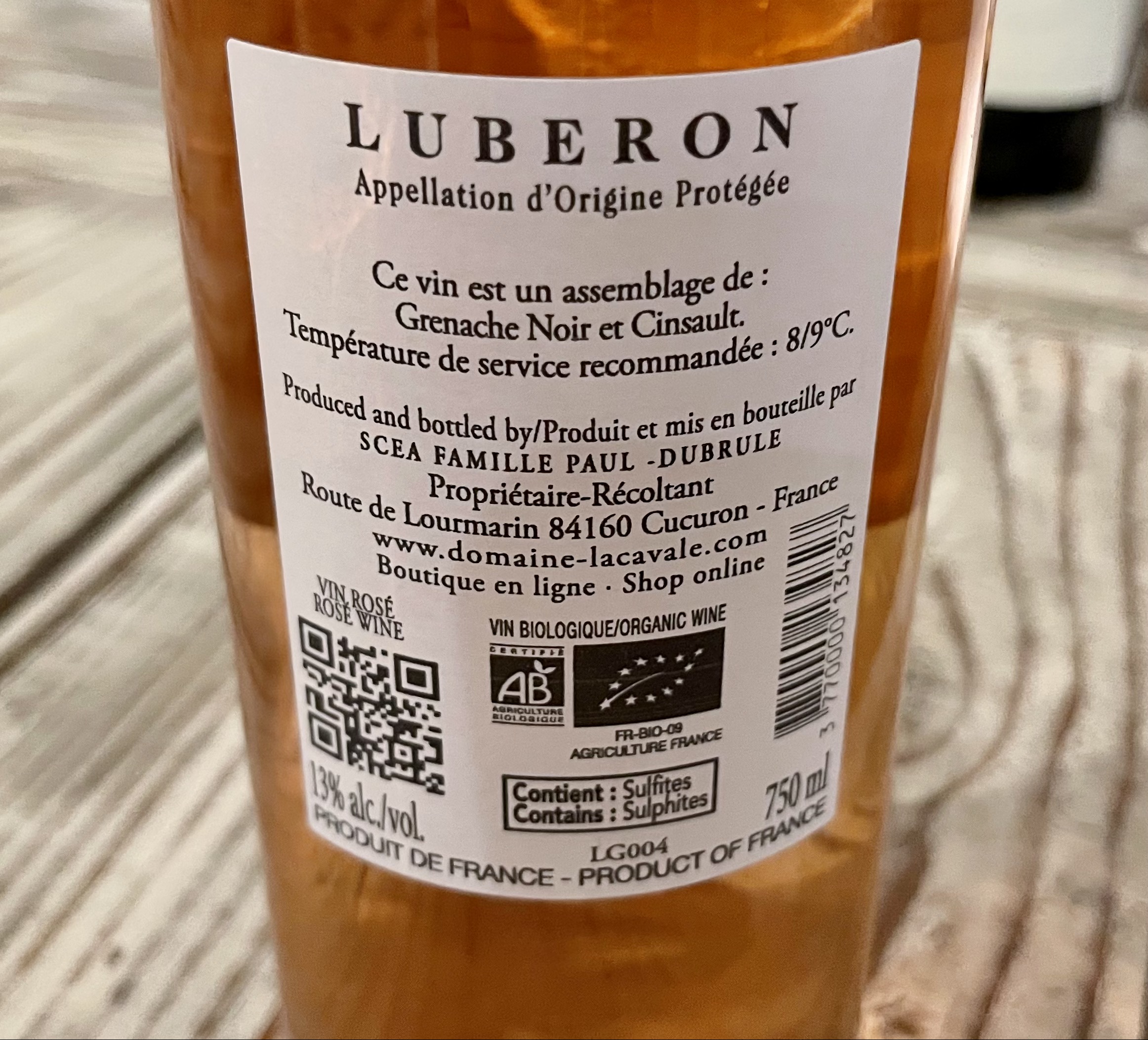The first La Cavale offering out of the gate immediately makes me question my tentative understanding of the Luberon’s blending rules above. The tech sheet (which you can conveniently access by scanning a QR code on the bottle) says that it’s a blend of 60% Grenache and 40% Cinsault. The former satisfies the at-least-60% rule for the principal grapes of the Luberon blend, but the latter seems to violate the suggestion that Cinsault must be 20% or less of the final wine. Maybe they’re more like guidelines anyway. This wine hails from three different plots of organic vines, harvested at dawn to maintain freshness and then vinified and briefly matured in stainless steel tanks.