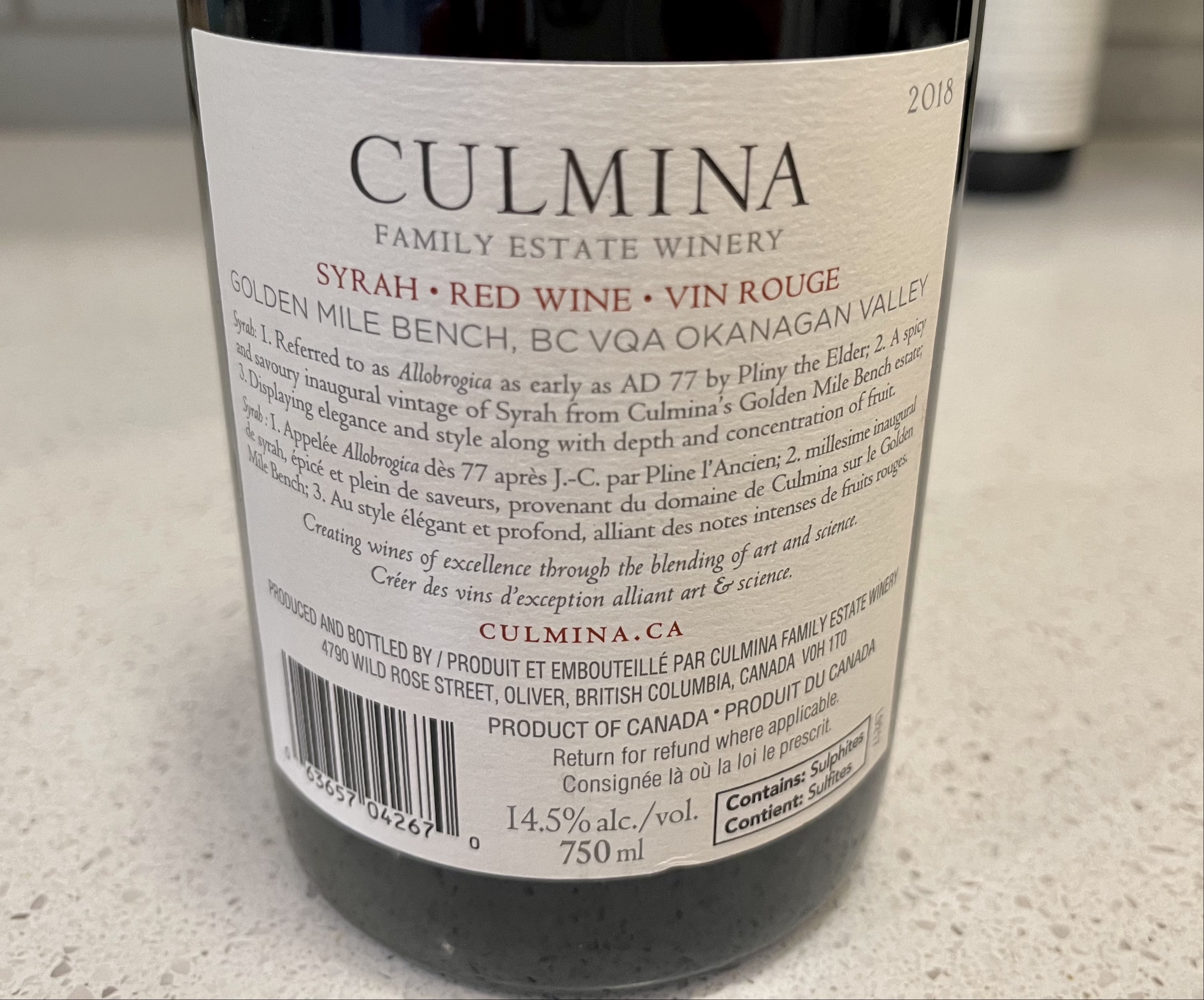 2018 Culmina Syrah ($42 cellar door)