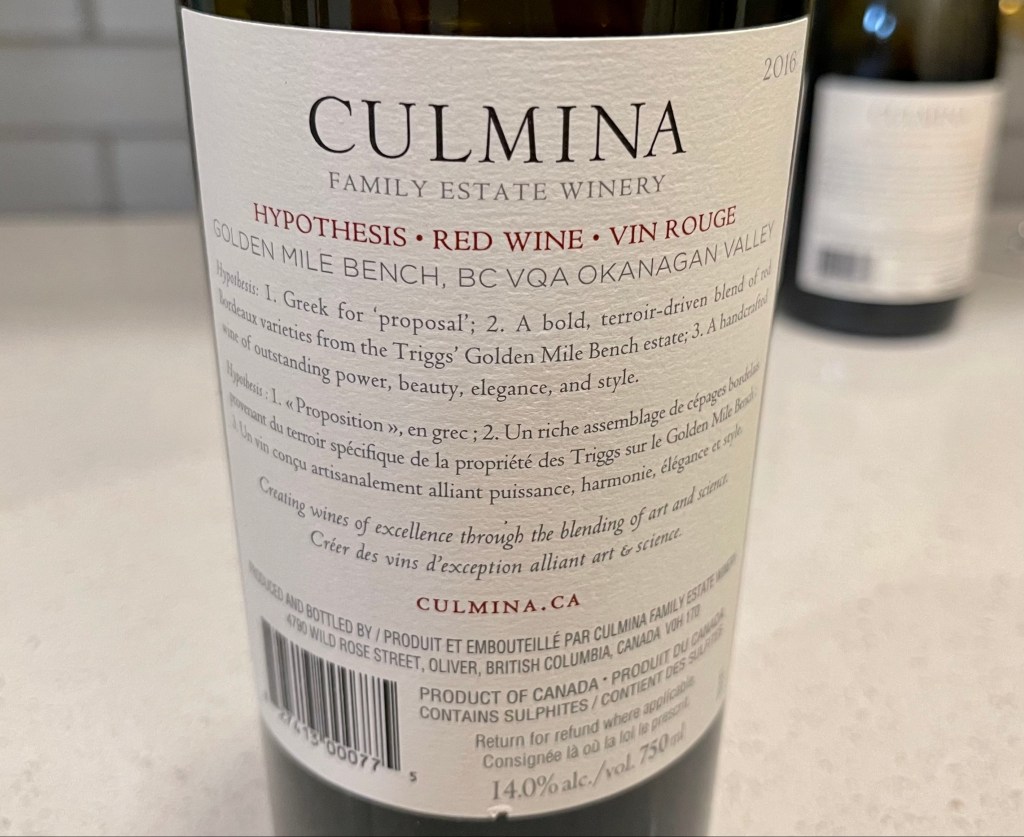 2016 Culmina Hypothesis ($46 cellar door)