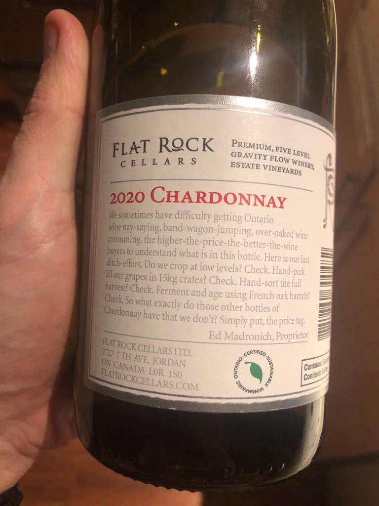 Ed Madronich Sr. founded Flat Rock Cellars about 40 years ago, and ultimately partnered with his son (also named Ed) to turn estate-grown grapes into wines of place. Their belief is that Chardonnay, Pinot Noir and Riesling are the classic varieties best suited to the Twenty Mile Bench’s relatively cool climes. Winemaker Allison Findlay and Canadian Burgundian-variety-pioneer-turned-part-time-consultant David Sheppard seamlessly blend state-of-the-art winemaking science and an artistic, creative flair to make their wines a reality. Flat Rock’s website is imbued with clearly explained technical details and brief flourishes of saucy humour in approximately equal measure, and the overarching gestalt is one that seems to work well for a boutique winery that has grown a bit beyond that label, albeit without compromising its core values. In “The Wines of Canada”, Rod Phillips explains that the winery’s name comes from the extremely stony vineyard soil that forces the vines to push their roots down deep, which Ed Jr. claims adds complexity to the wines. Let’s drink, shall we?