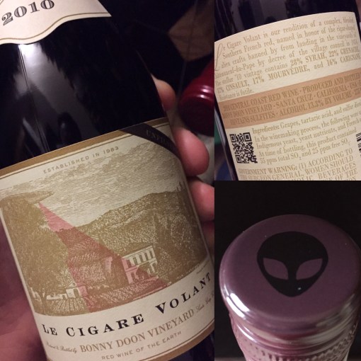 Initially, I wasn’t sure what to think when I unwrapped the top of the bottle to see an alien face on the top of a screw cap. With such graphics, is this some gimmicky bottle of wine? Further unwrapping showed a 2010 vintage with an old-looking label with the title Le Cigare Volant, which, from my rusty French, I knew translated to The Flying Cigar. A quick turn of the bottle discloses that the wine is a southern Rhone blend (think Chateauneuf-du-Pape) from Santa Cruz, California, and produced by Bonny Doon Vineyard, a name I have heard of before but never tasted any of their wines. Also included on the back label was an explanation of the name of the wine which is an interesting and surprising story. In 1954, a law was passed in the Chateauneuf-du-Pape region banning unknown alien aircraft known as flying saucers (or, in France, flying cigars) in the area and stating that any such craft landing within the area will be held in custody. Yes, this is an actual law in Chateauneuf-du-Pape! Ok, everything is starting to make sense now, and it definitely has my attention.